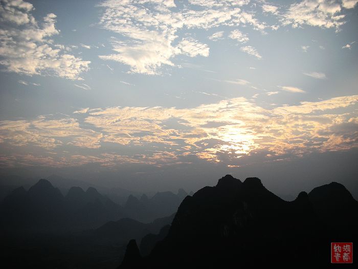 第二天清晨五点,浏阳河老师就来敲门了,叫大家去拍日出,我们一行十几人带上手电相机就出发了。进山以后,我才真切地体会到“黎明前的黑暗”之暗,那山和树一片黑鸦鸦地,向你压来,令人生畏,我赶快打开手电,前后照着周围的同伴。越往上走,山越难爬了,特别是那石板路,不但很窄,而且还不平,一级石阶只能放一只脚,左脚踏上这级石阶,右脚就必须踏更高的一级石阶,这就更难更险了,我们平常说的爬山,不管怎样还是走上去的,到了这里才叫名符其实的“爬”山了,我看到淮羽的仙妻还有一些同伴都在手脚并用地往上爬。直到爬得连路都没有了,只剩一架铁云梯靠着山壁竖在眼前,我真的有点手脚发软了,可到了这里也只能继续前进,同伴们都喊不要往下和往两边看,看到前面的同伴都顺利地爬上去了,我鼓起“上九天揽月”的勇气,也爬上去了。再拐过一个弯,就看到了山顶,听到了先上去的湖边士的欢呼声。我紧走几步,登上山去,终于有了“无限风光在险峰”和“一览众山小”的自豪。
