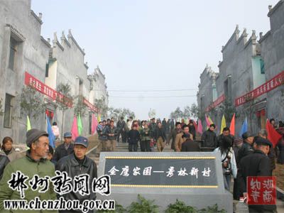 新村处龙王岭山系之中,临便江水流之畔;南明北秀,东润西暄。山有度而环抱有情,水生韵而曲屈有意;惠风和畅而田垌吟歌,阳光和煦而林果起舞;马头墙述民居古韵,塑钢窗传时代信息;道路宽畅,车水马龙物流丰;巷闾焕彩,老怡少乐村落美。俨然成旅游观光休闲之农家山庄,刘公之意,民有所居,居有所养者矣。
