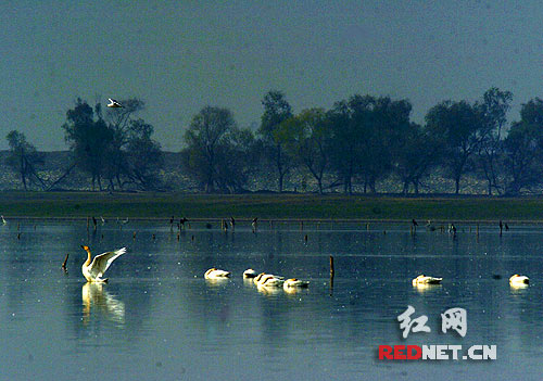 美丽的天鹅和许多候鸟一起来到洞庭湖湿地越冬。