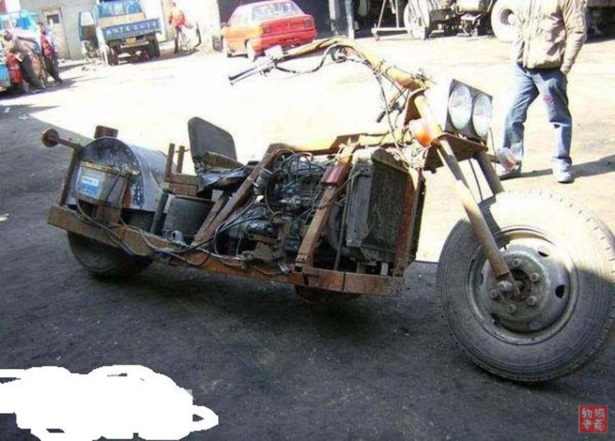 发明家: “你们别灰心啊!俺琢磨着这机器敢情太重了,做飞机他也不合适哩,俺就把那破飞机拆了焊巴焊巴装了台摩托车。哦,这是照片。”