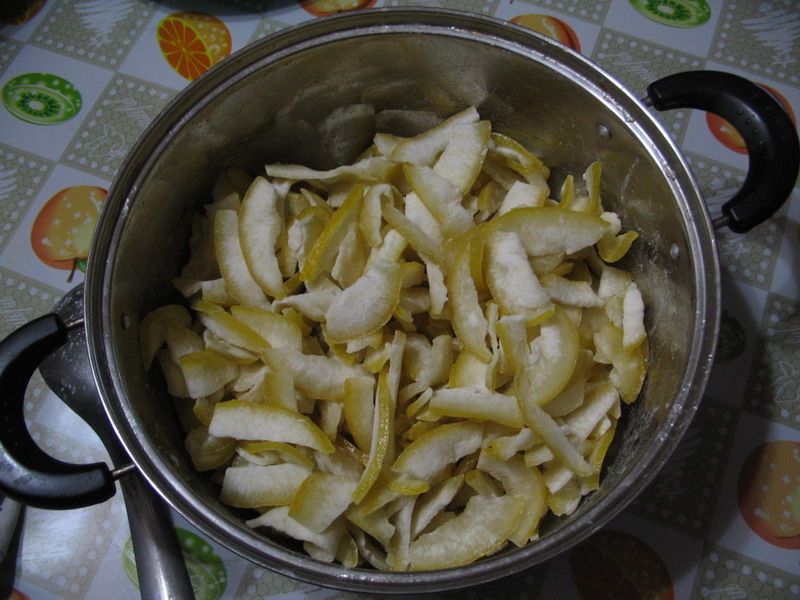 2,将切好的柚子皮薄片在烧开的水中氽一下,捞出来放在清水中漂二天,每天换一次水.